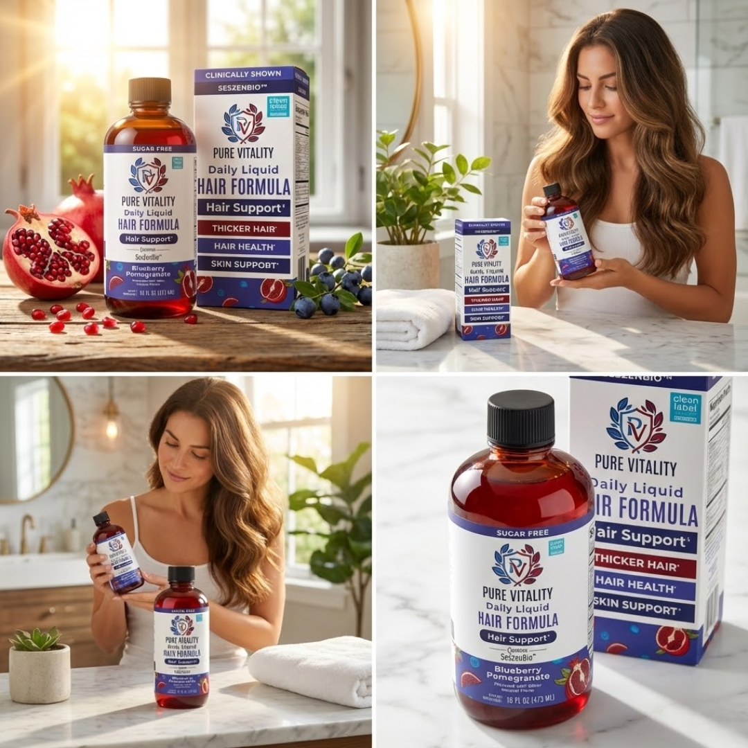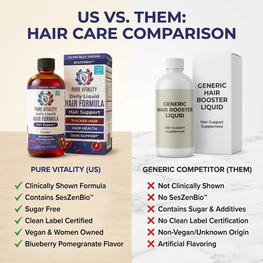 Pure Vitality™ Daily Liquid Hair Formula is clinically shown and formulated with SesZenBio™, a studied ingredient designed to support thicker, healthier-looking hair. Unlike generic hair booster liquids, our formula is sugar-free, clean-label certified, vegan, and made without unnecessary additives or artificial flavoring. Choose a formula backed by science—not shortcuts.
