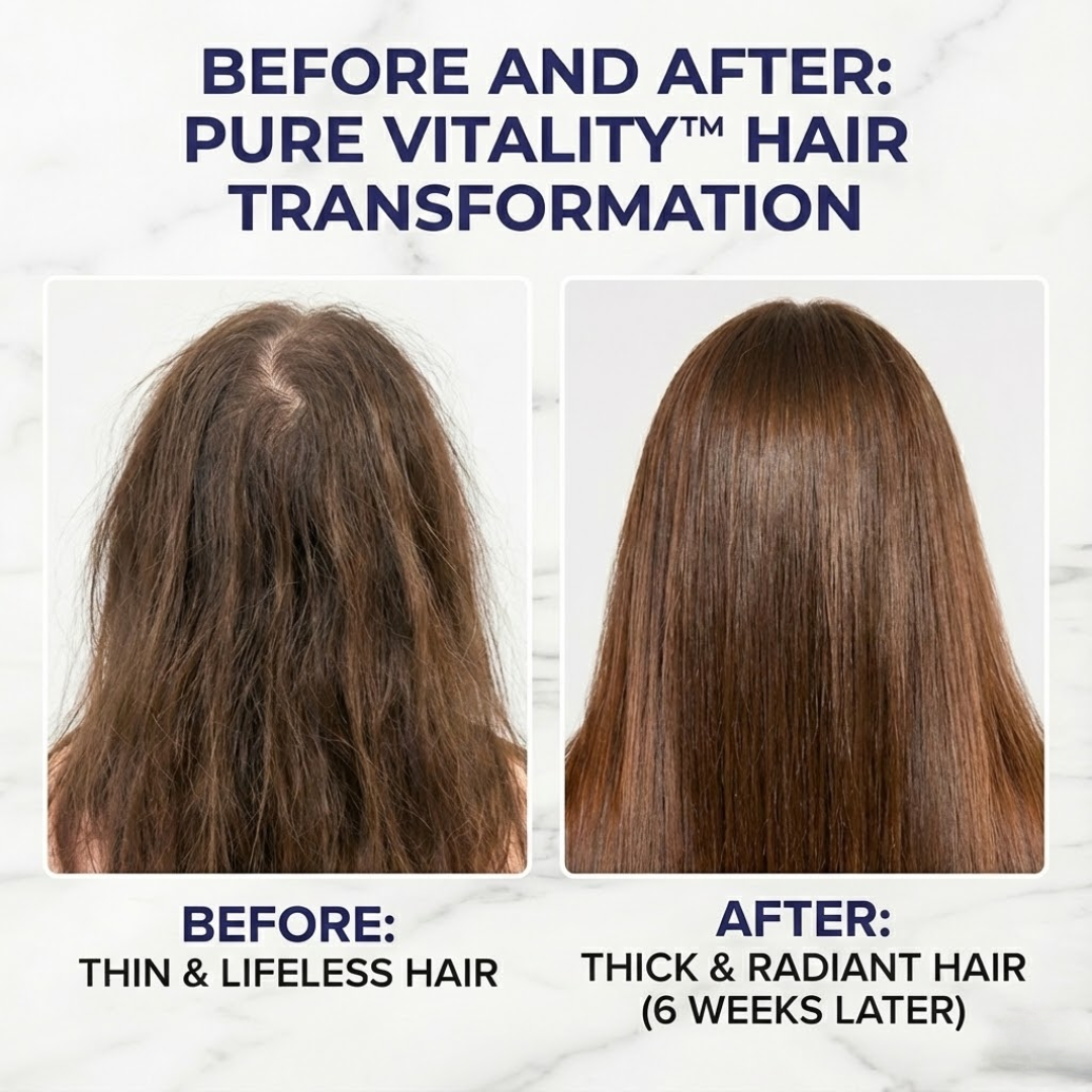 With consistent daily use, Pure Vitality™ Daily Liquid Hair Formula helps support visibly thicker, fuller-looking hair. In as little as 6 weeks, hair can appear healthier, smoother, and more radiant as targeted nutrients work from the inside out. Results shown reflect real users and are based on regular use as part of a daily routine.